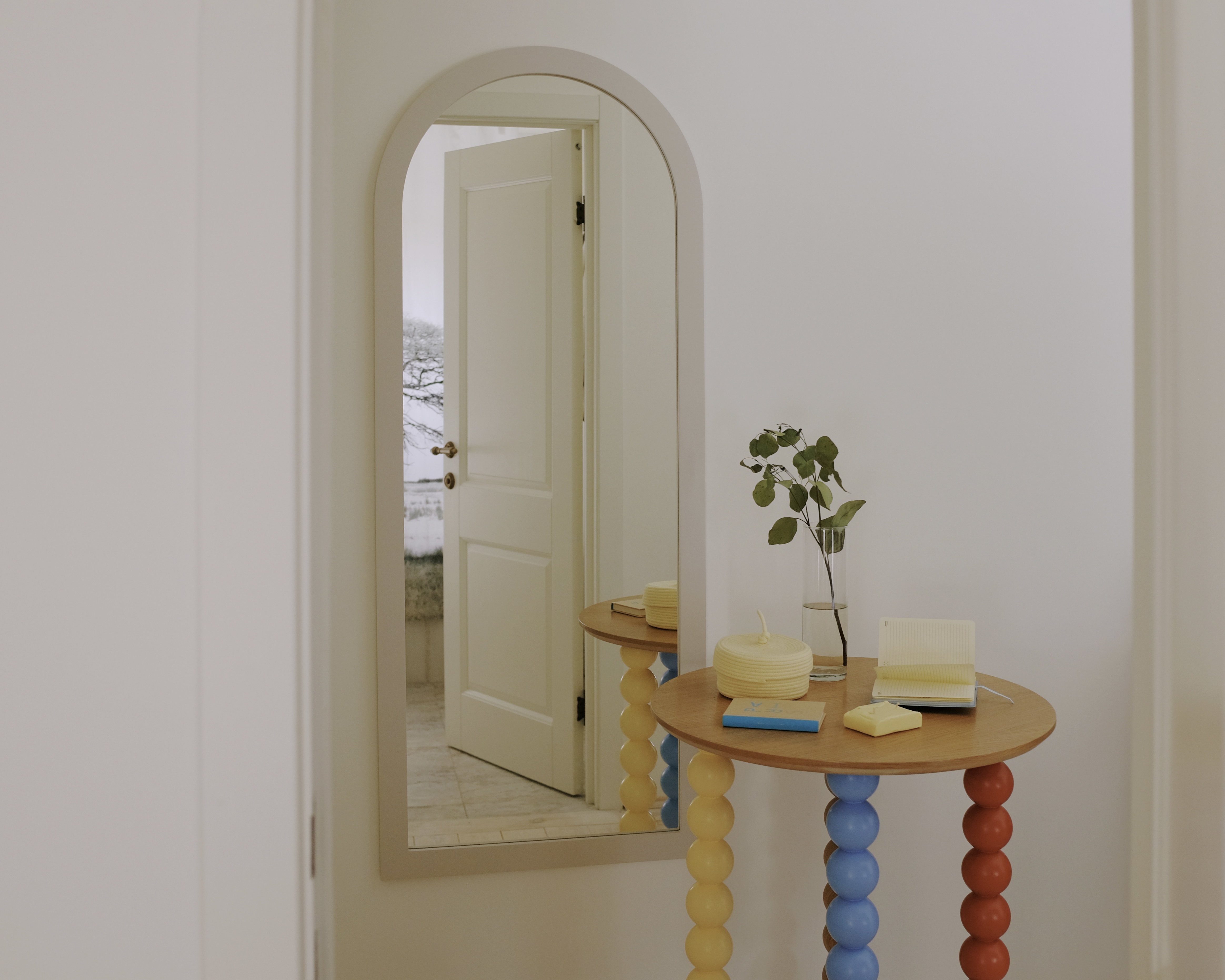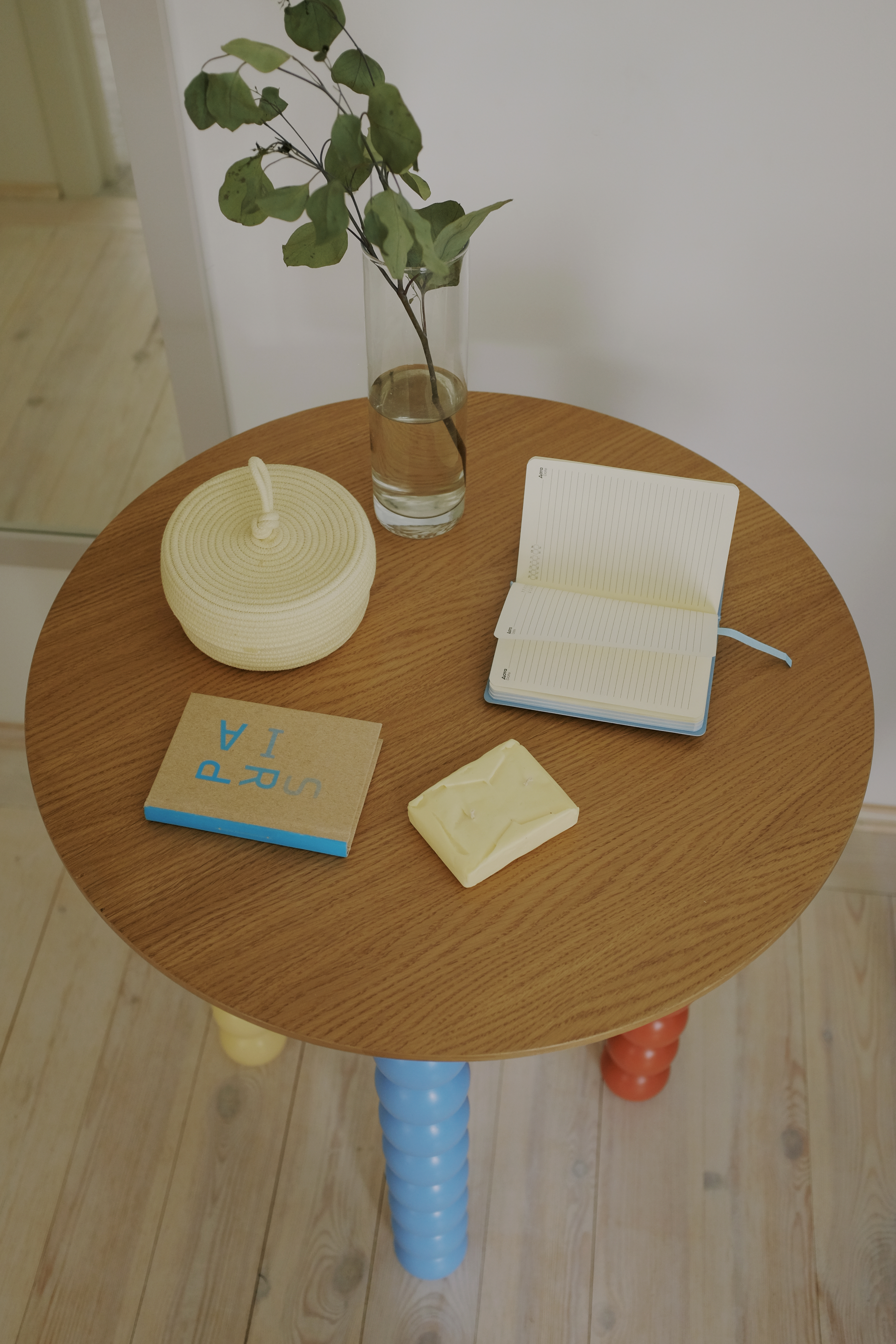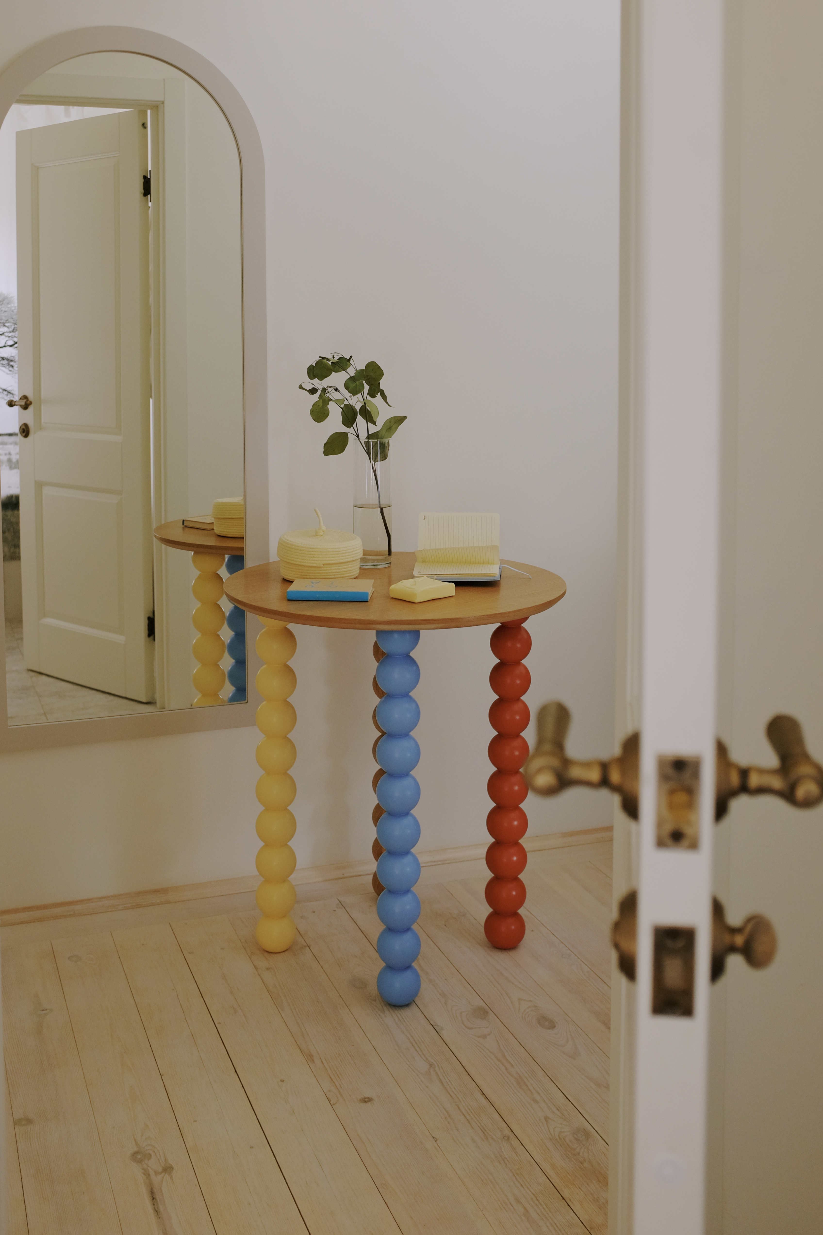 И конечно, не можем не упомянуть новинку — столик с разноцветными ножками-бусами. «Я влюбилась в него с первого взгляда — настоящий арт-объект! Сейчас он живёт как будуарный столик, но его легко передвинуть, для смены настроения», — делится она.