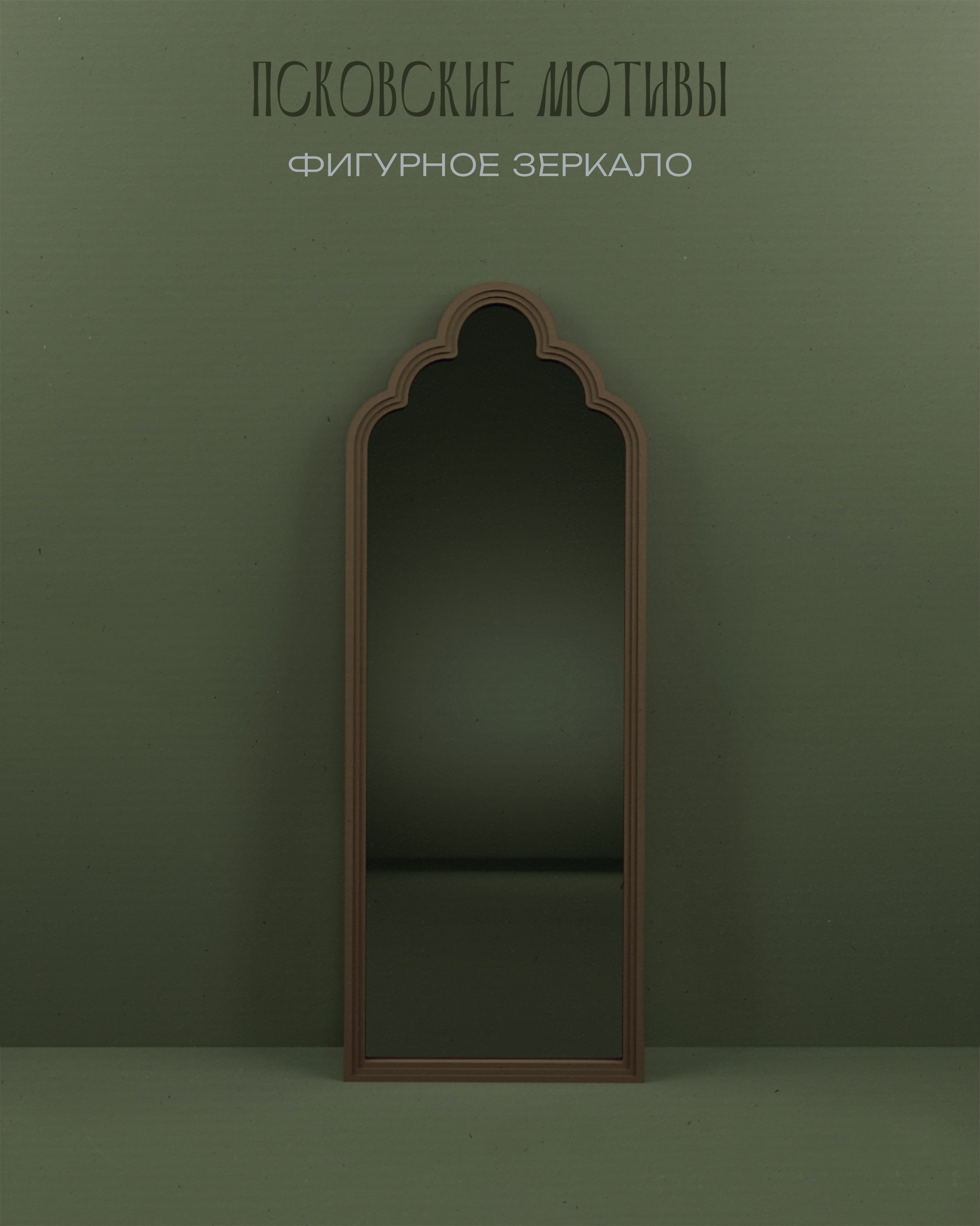 Фигурное зеркало с плавными очертаниями напоминает мягкие линии псковских храмов. Его рама выполнена из массива дуба, а натуральное покрытие подчеркивает природную текстуру древесины.