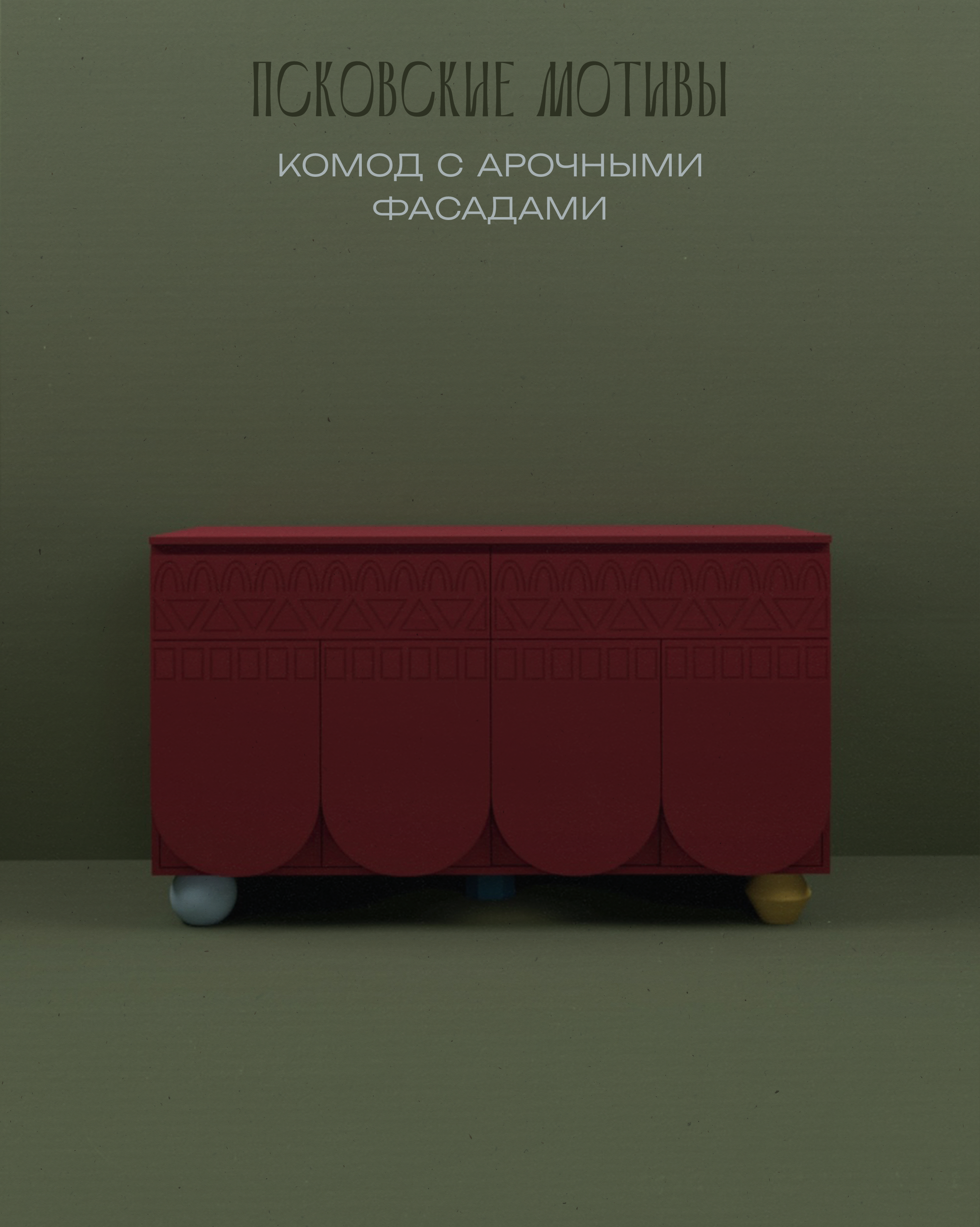 Комод с арочными фасадамиповторяет силуэты старинных церквей. Фрезеровка на его дверцах вдохновлена узором на барабанах древних храмов.
