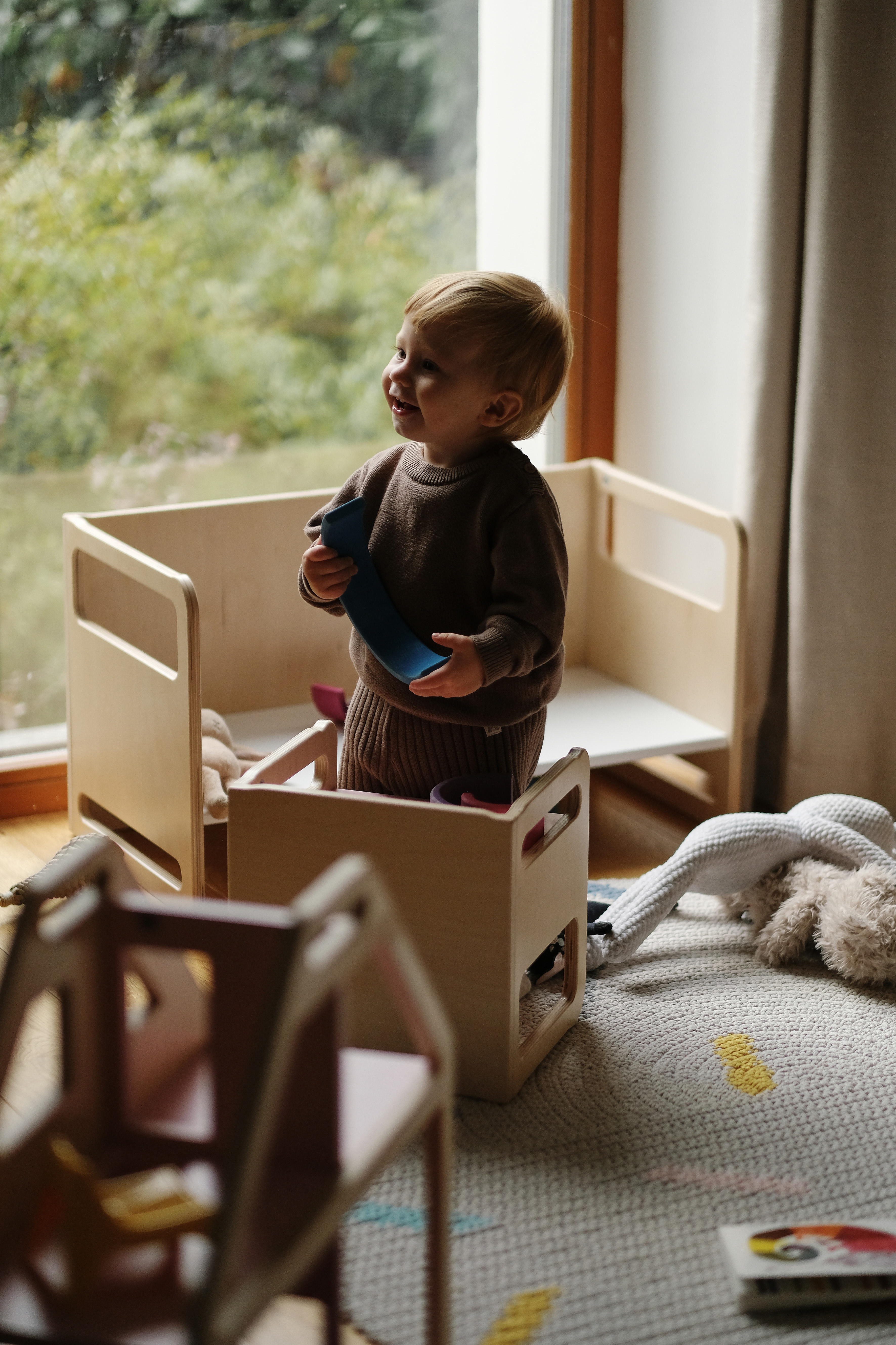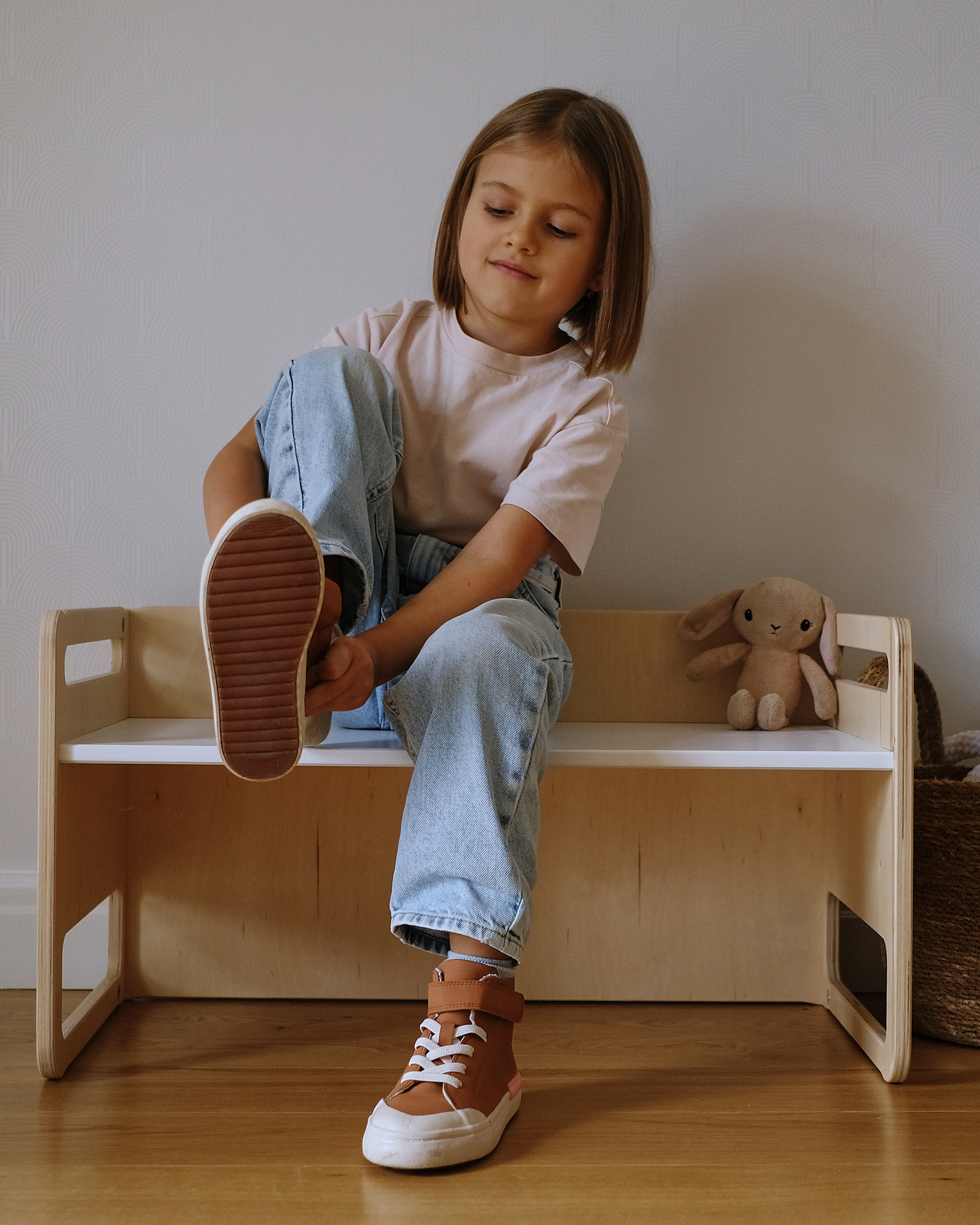 На скамейке удобно сидеть и легко обувать свои маленькие ботиночки. Или подняться на нее, чтобы дотянуться до чего-то сверху.