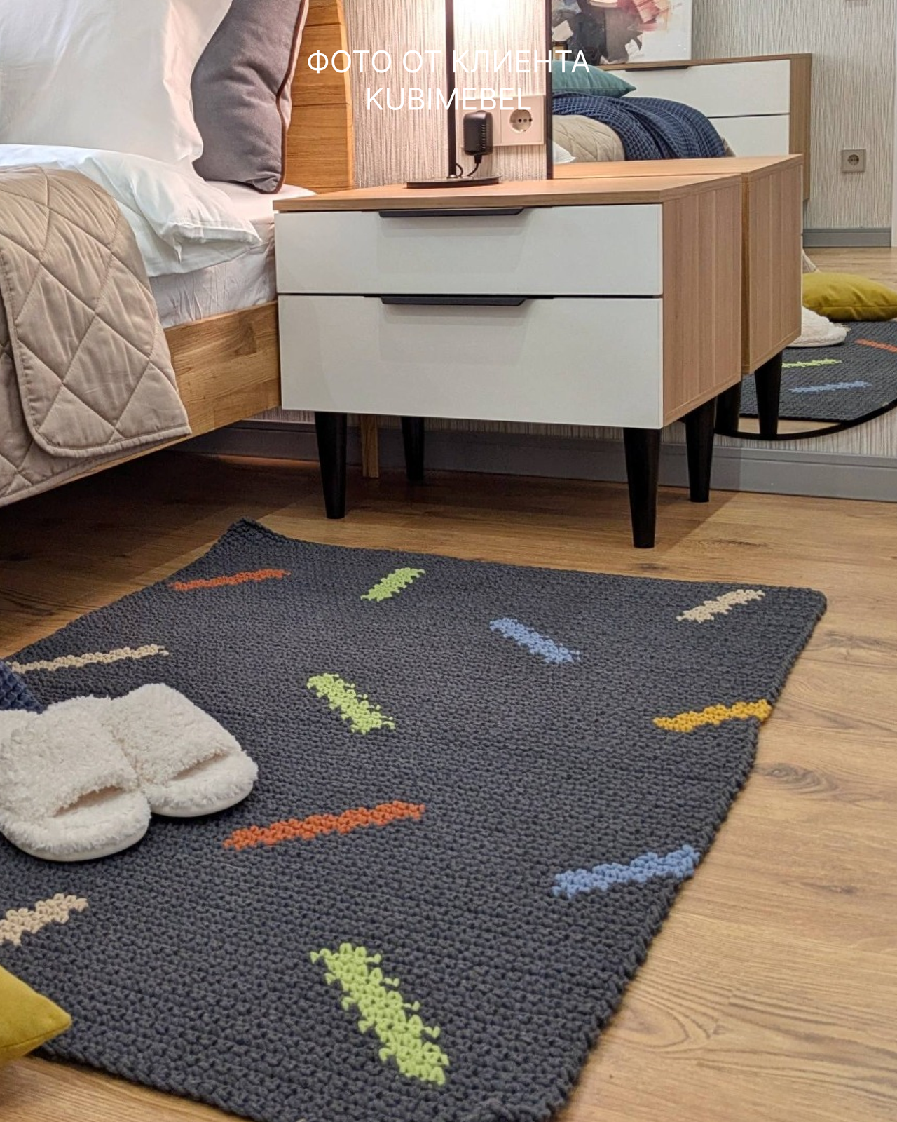 Вязаный ковёр является идеальным дополнением интерьера детской комнаты. Он выполнен из натуральных материалов, обладает массажным эффектом и может быть изготовлен в любых цветах и размерах, подходящих в интерьер первой и такой важной комнаты маленького человека. Психологи советуют с раннего детства наполнять физическое пространство ребёнка эстетически привлекательными предметами, чтобы с детства у ребёнка форсировался адекватный эстетический интеллект, который в современном мире играет одну из ключевых ролей в жизни и творчестве человека.