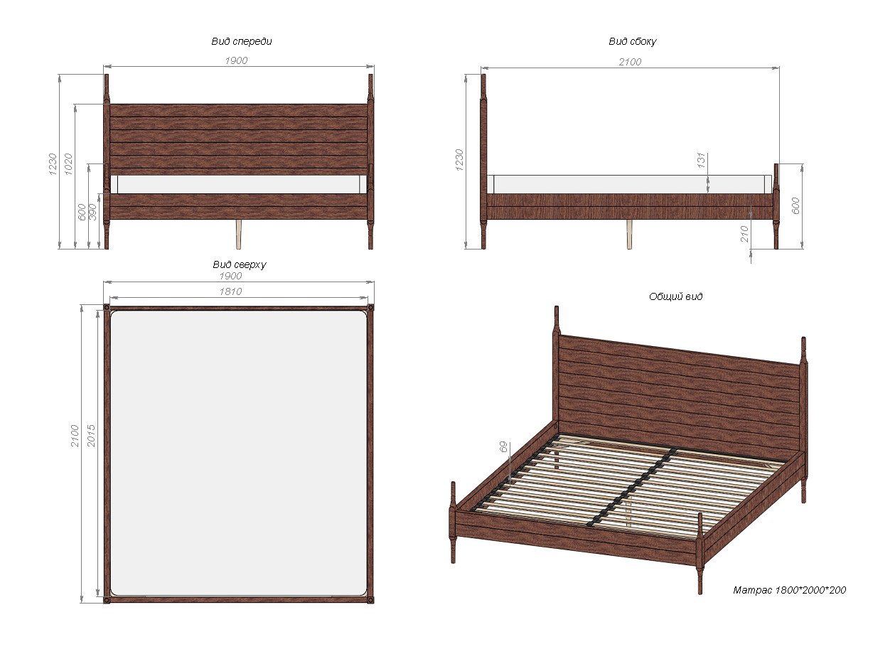 Каркас покрыт морилкой и прозрачным лаком. Насыщенный темный цвет придает кровати изысканности.