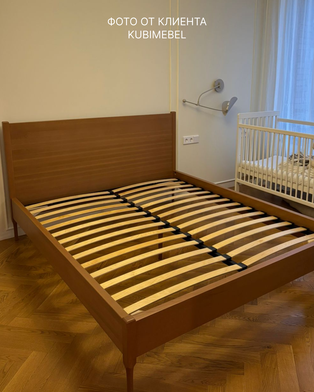 Каркас покрыт морилкой и прозрачным лаком. Насыщенный темный цвет придает кровати изысканности.