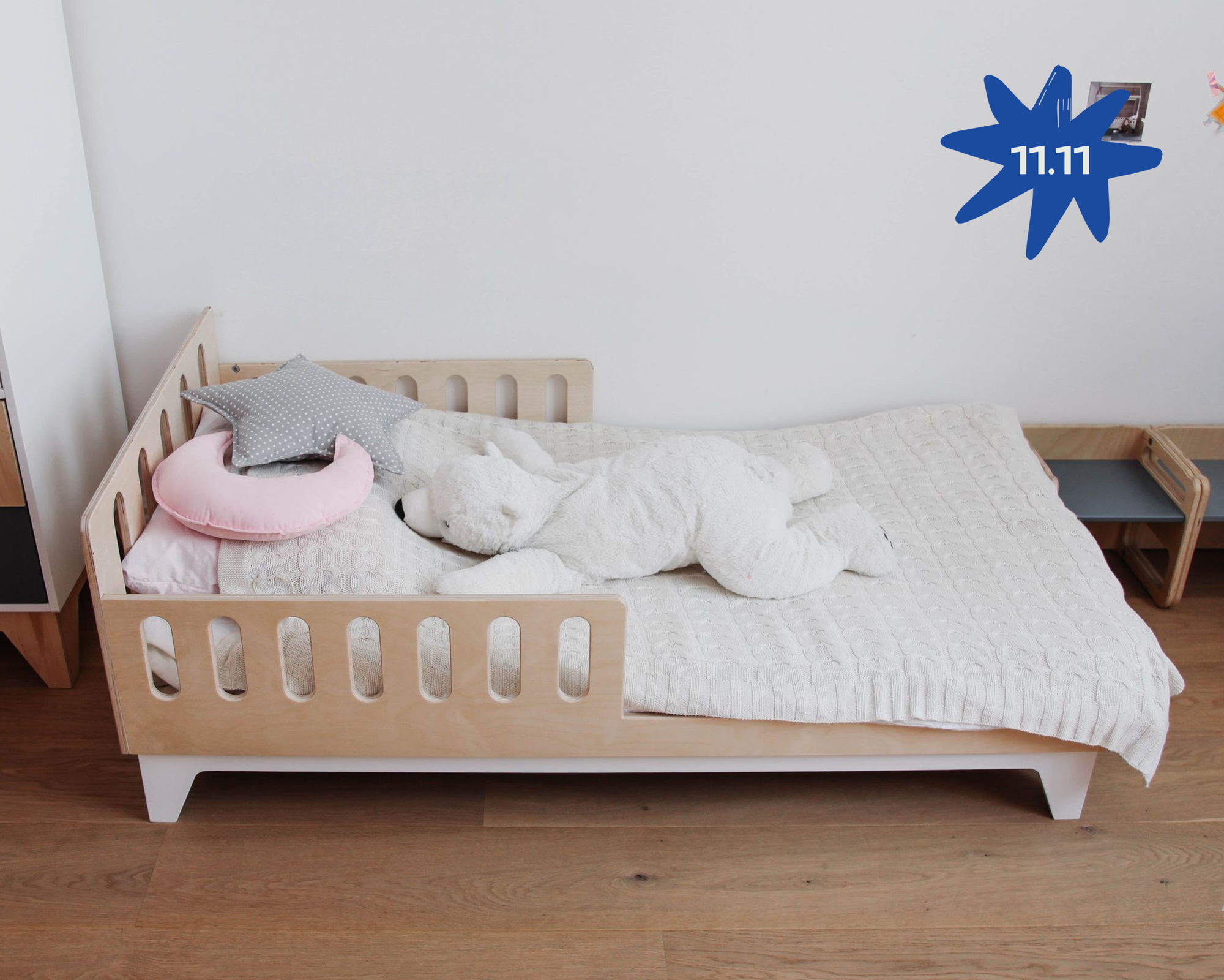 Удобная кровать с бортиками подходит для подросших малышей от двух лет.