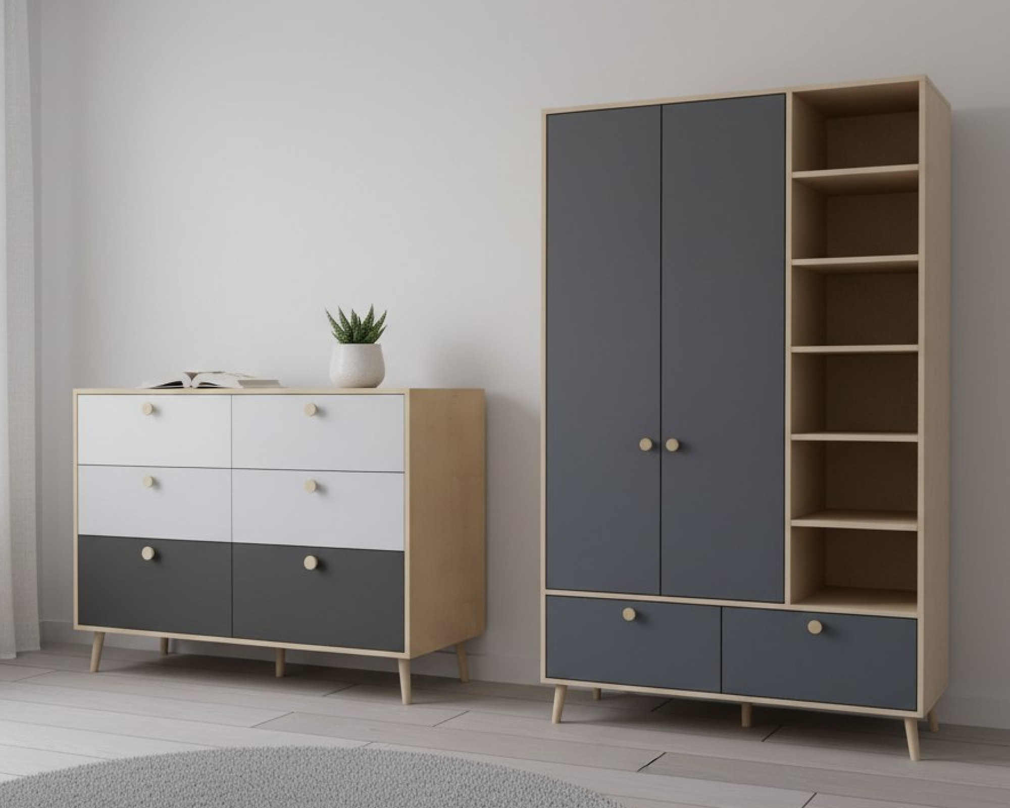 Данный шкаф сочетает в себе отсек со штангой для одежды, выкатные ящики и открытые полки, где вы можете разместить вещи, свои любимые предметы декора, книги, посуду и другие мелочи.