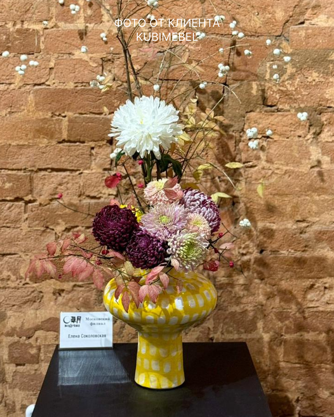 Керамическая ваза в ярком жёлтом цвете с геометрическим узором в белую клетку. Форма с устойчивым основанием и расширенной верхней частью подходит для композиций из цветов или сухоцветов, а также может использоваться как самостоятельный декоративный акцент.