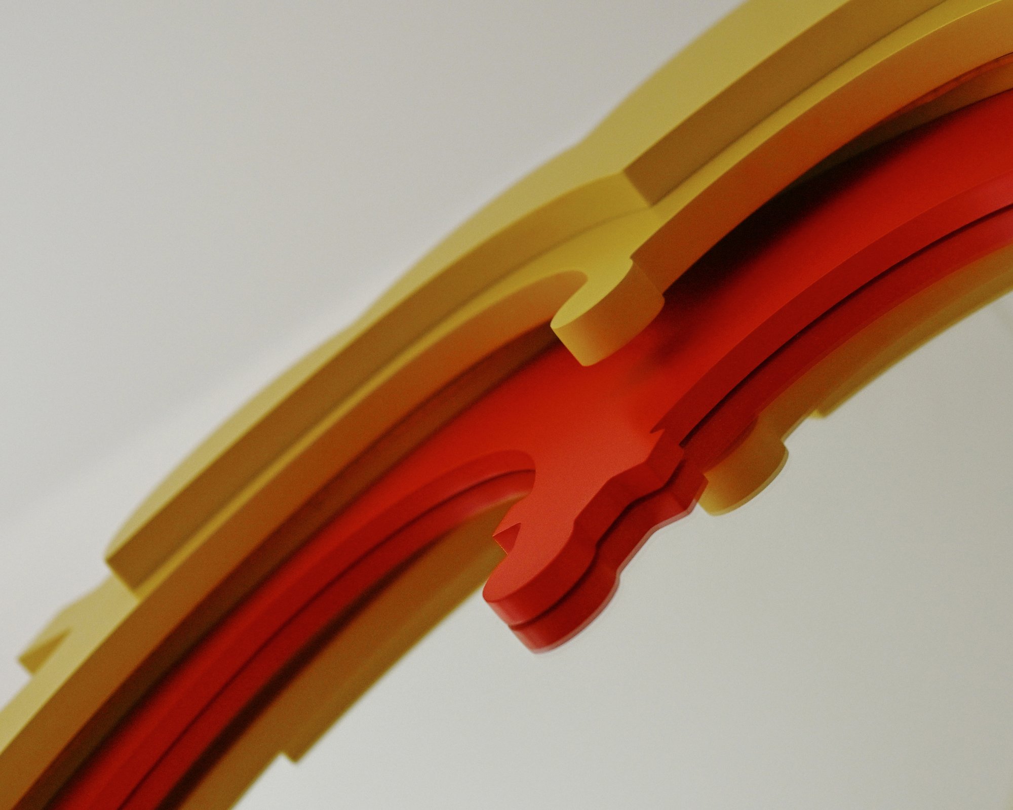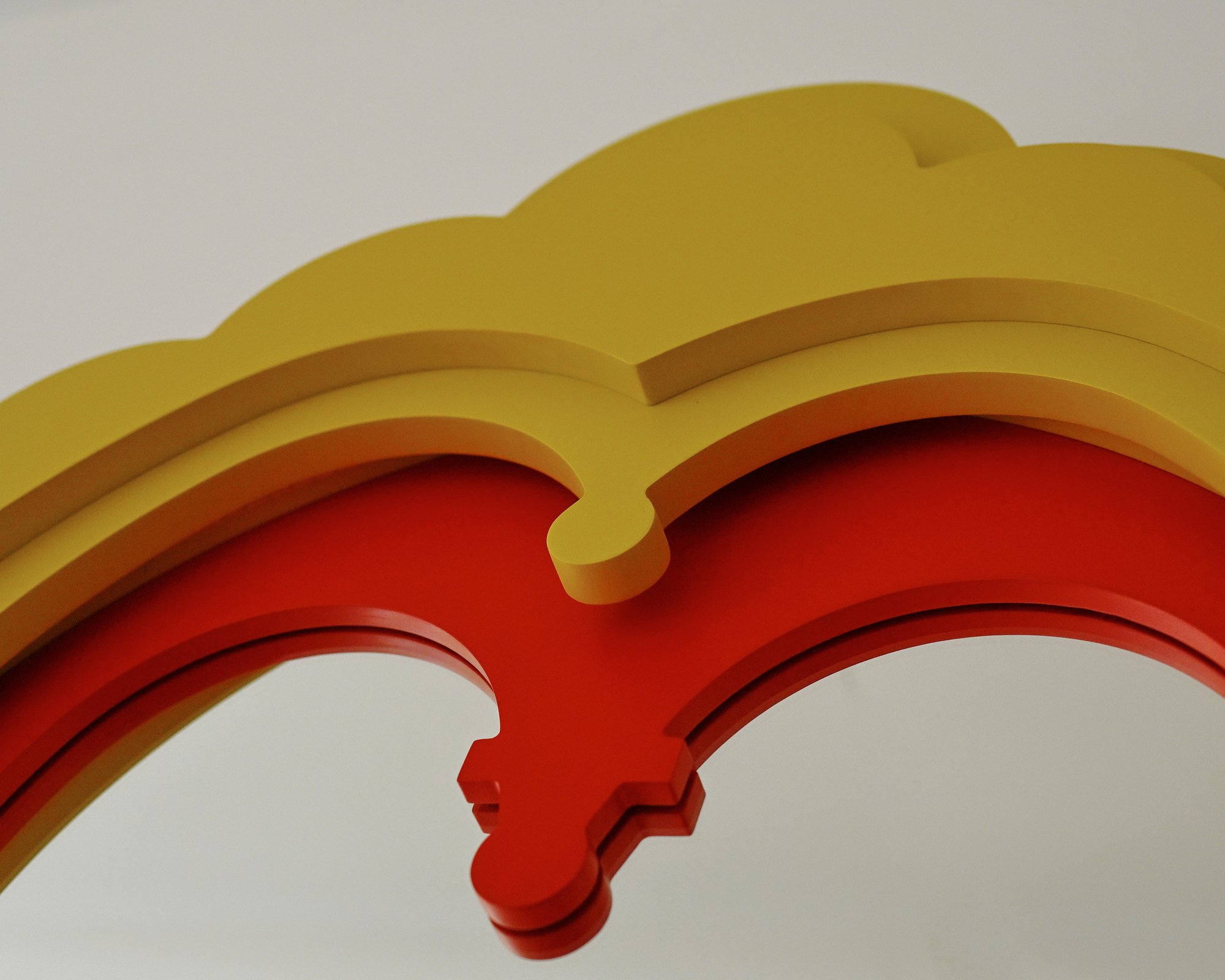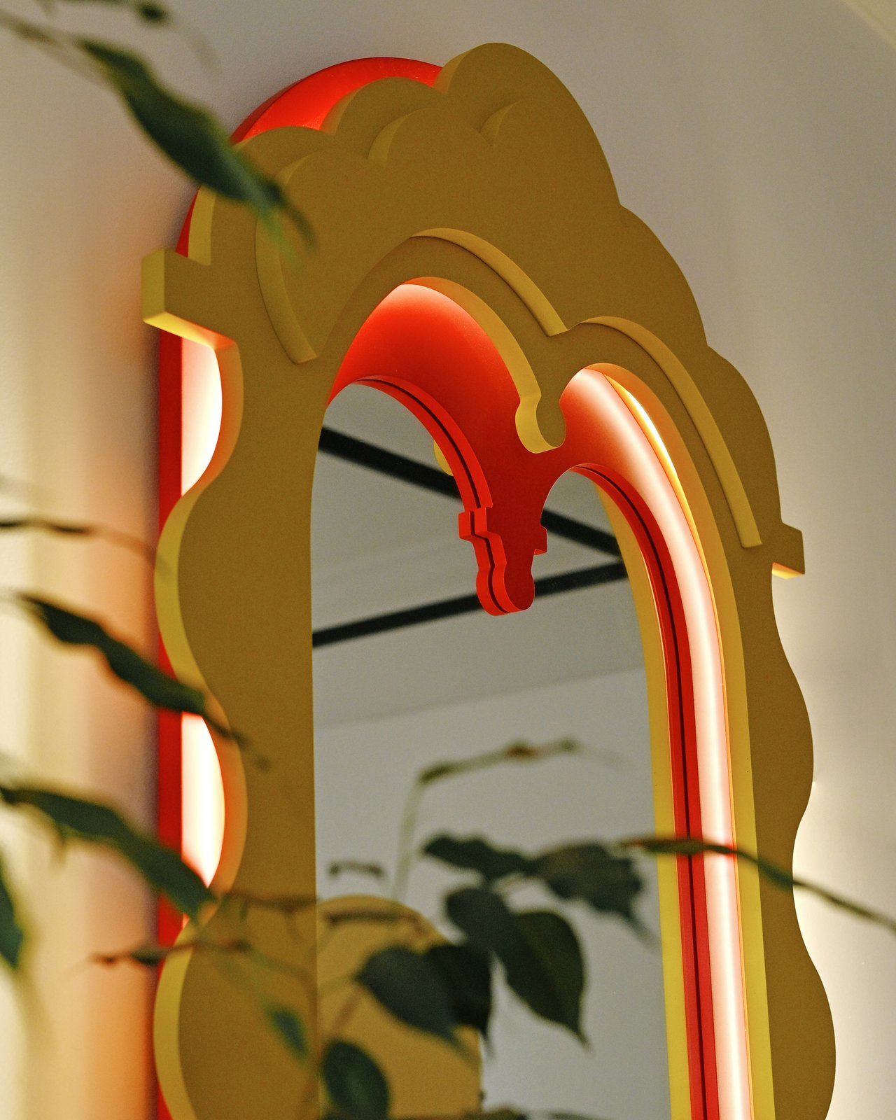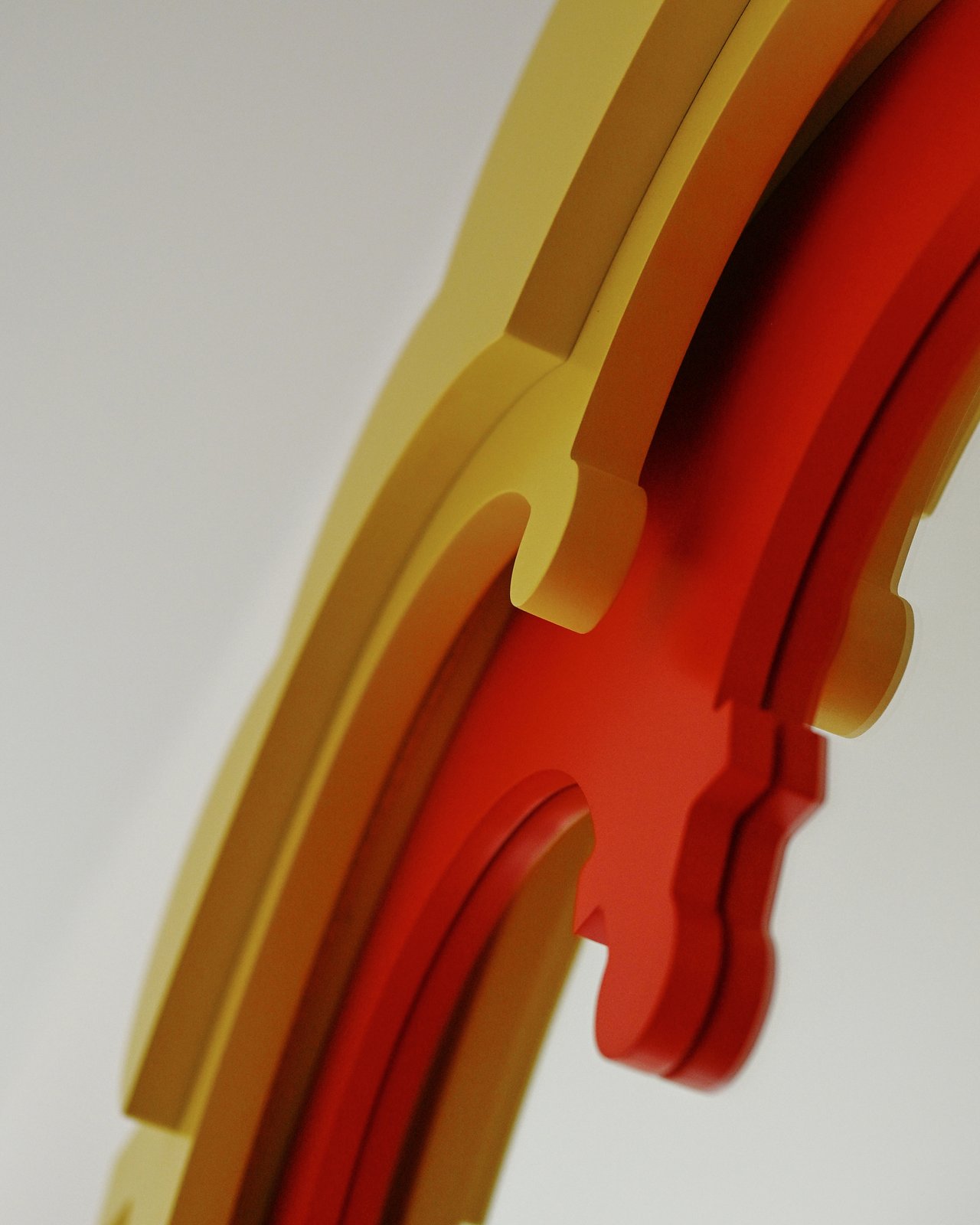 Его выразительная рама, сочетающая плавные линии, яркие цвета и декоративные элементы, отсылает к архитектурным традициям Псковской земли, переосмысленным в современном дизайнерском ключе.